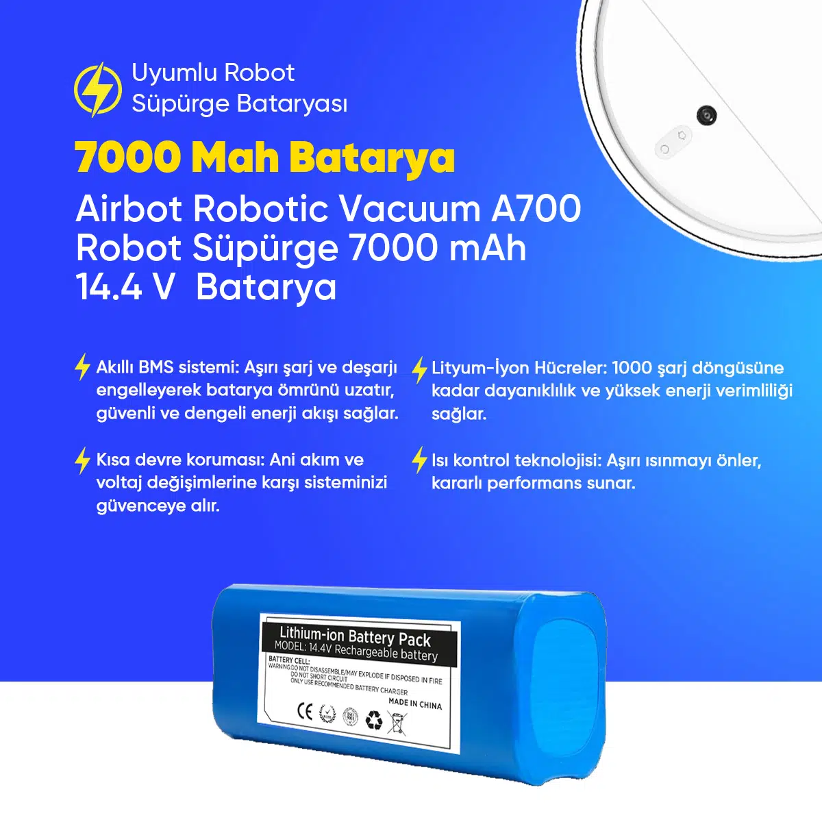 | Etiketler | Airbot Robotic Vacuum A700 Robot Süpürge 7000 mAh 14.4 V Batarya – Orjinal Uyumlu Uzun Ömürlü, Yüksek Performans Pil |