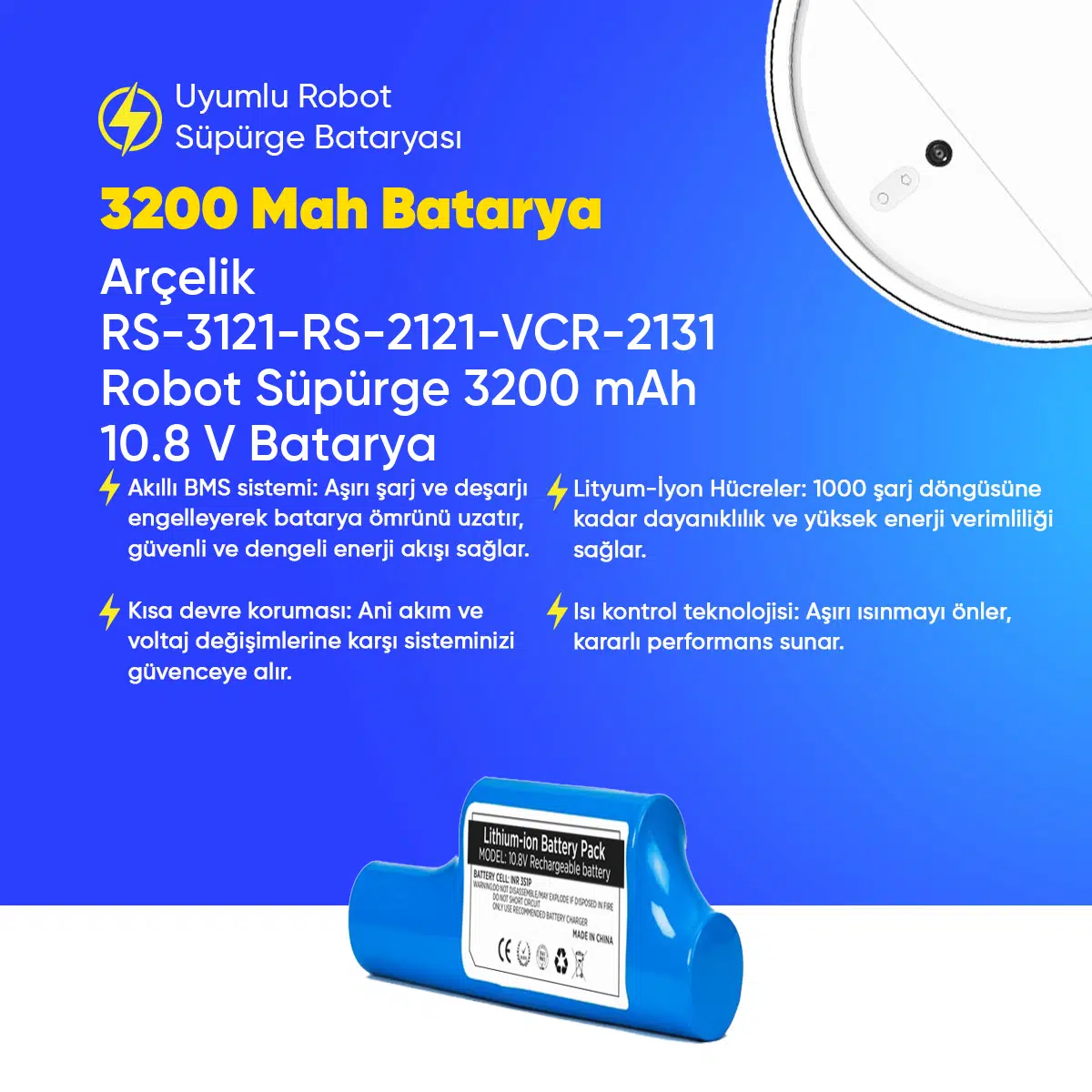 | Etiketler | Arçelik RS-3121-RS-2121-VCR-2131 Robot Süpürge 3200 mAh 10.8 V Batarya – Orjinal Uyumlu Uzun Ömürlü, Yüksek Performans Pil |