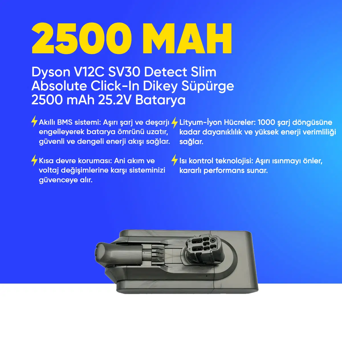 | Etiketler | Dyson V12C SV30 Detect Slim Absolute Click-In Dikey Süpürge 2500 mAh 25.2 V Batarya – Orjinal Uyumlu Uzun Ömürlü |