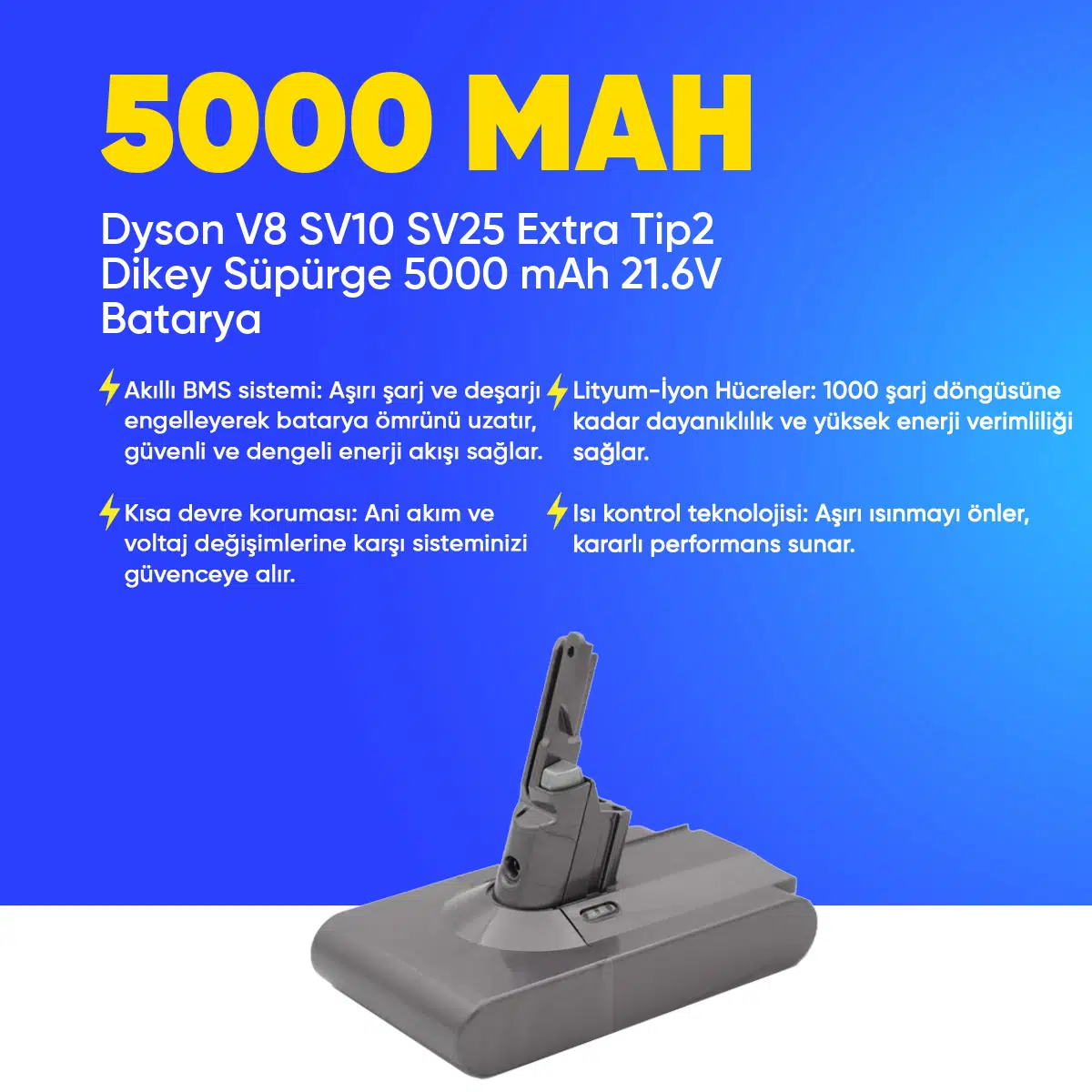 | Etiketler | Dyson V8 SV10 SV25 Extra Tip2 Dikey Süpürge 5000 mAh 21.6 V Batarya – Orjinal Uyumlu Uzun Ömürlü, Yüksek Performans Pil |