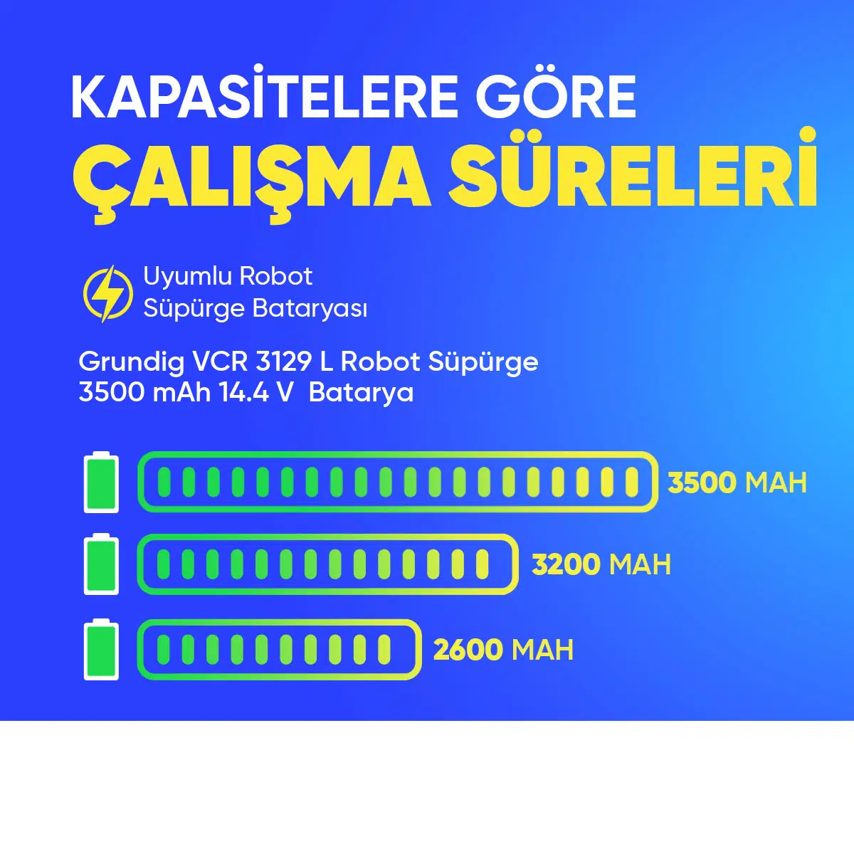 | Etiketler | Grundig VCR 3129 L Robot Süpürge 3500 mAh 14.4 V Batarya – Orjinal Uyumlu Uzun Ömürlü, Yüksek Performans Pil |