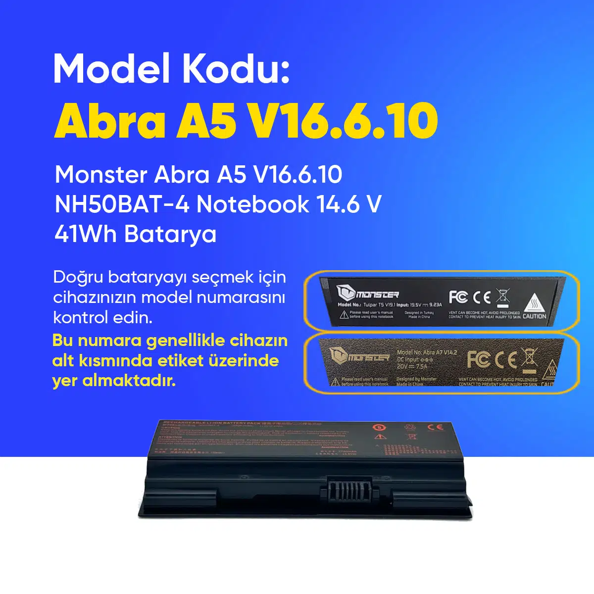 | Etiketler | Monster Abra A5 V16.6.10 NH50BAT-4 Notebook 14.6 V 41Wh Batarya – Orjinal Uyumlu, Yüksek Performanslı |