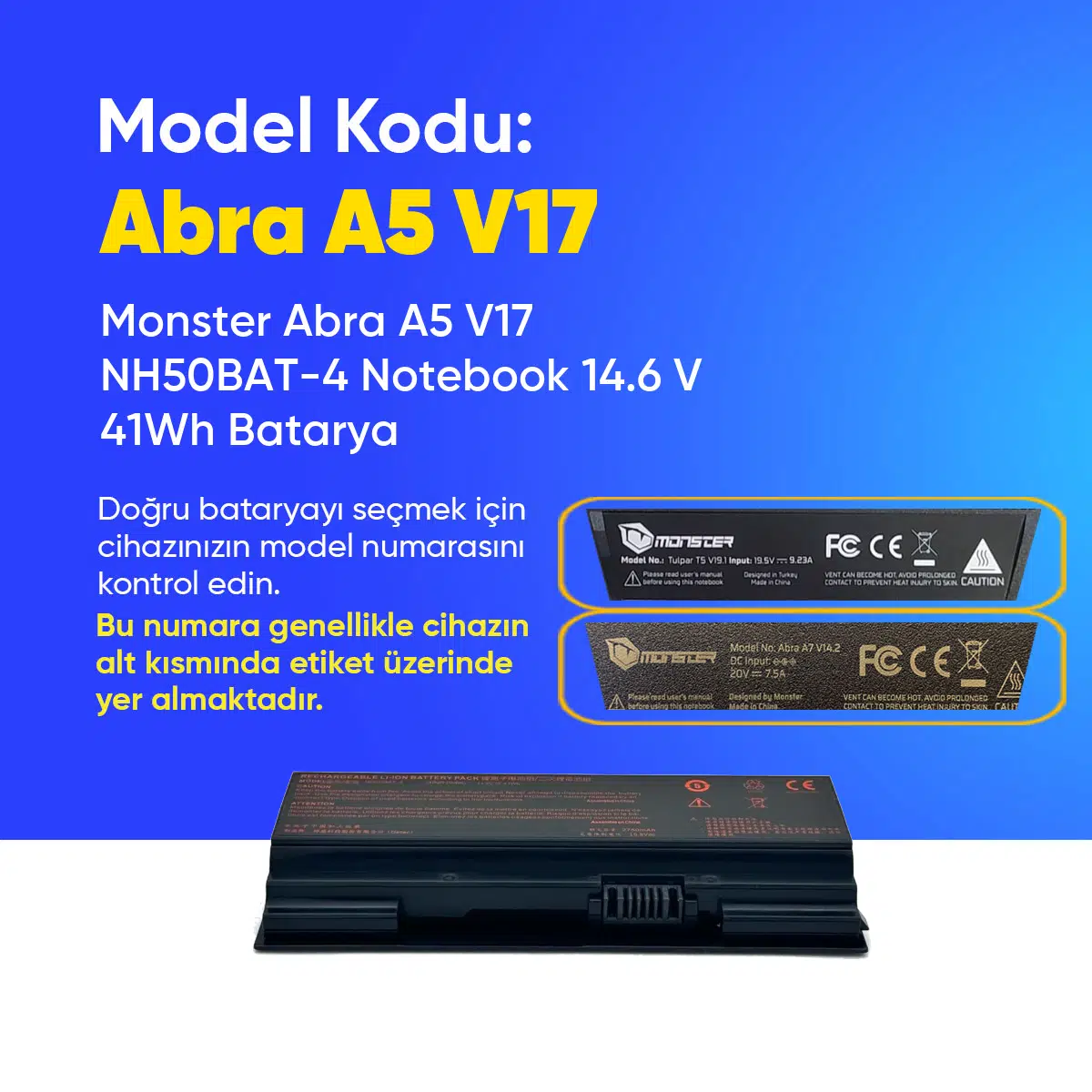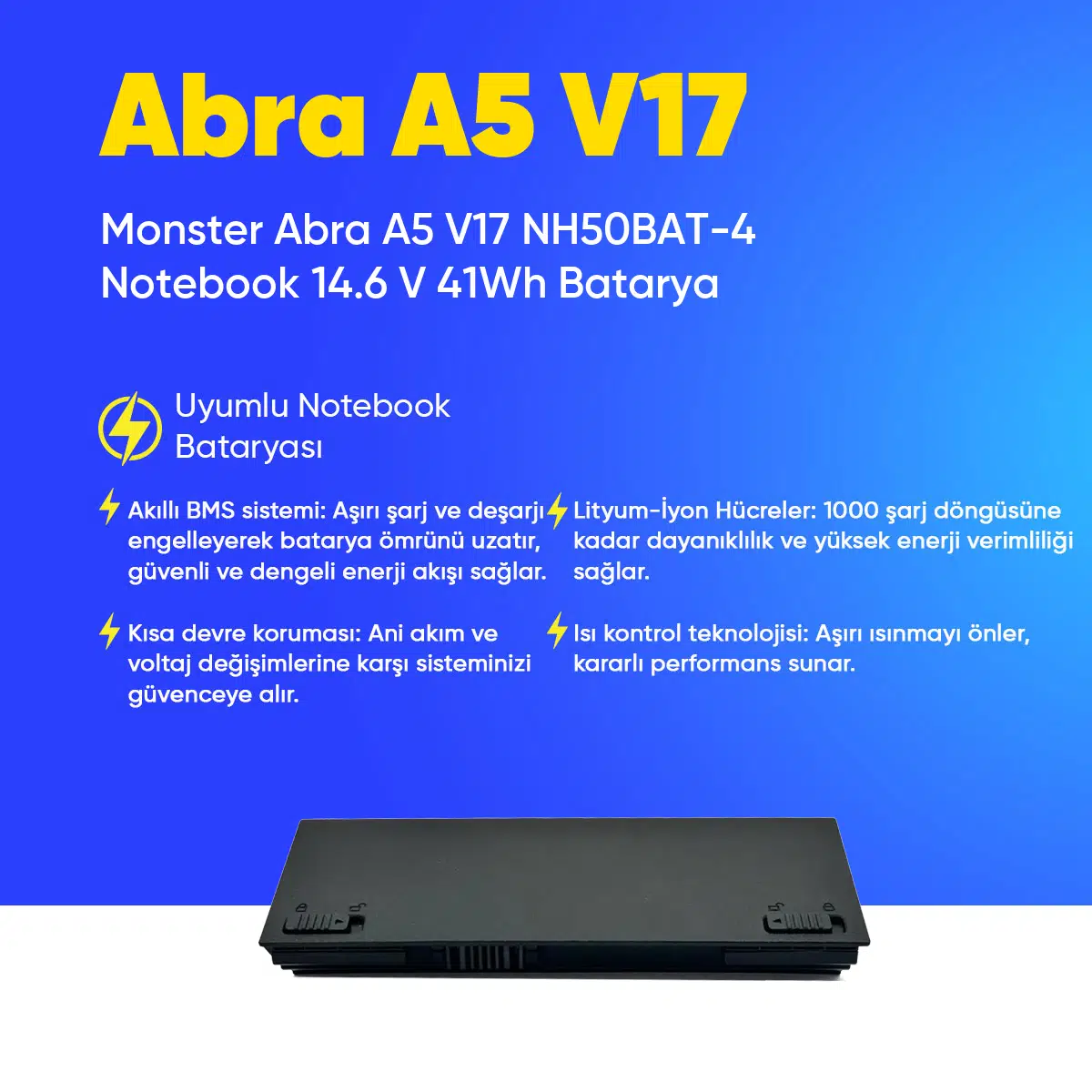 | Etiketler | Monster Abra A5 V17 NH50BAT-4 Notebook 14.6 V 41Wh Batarya – Orjinal Uyumlu, Yüksek Performanslı |