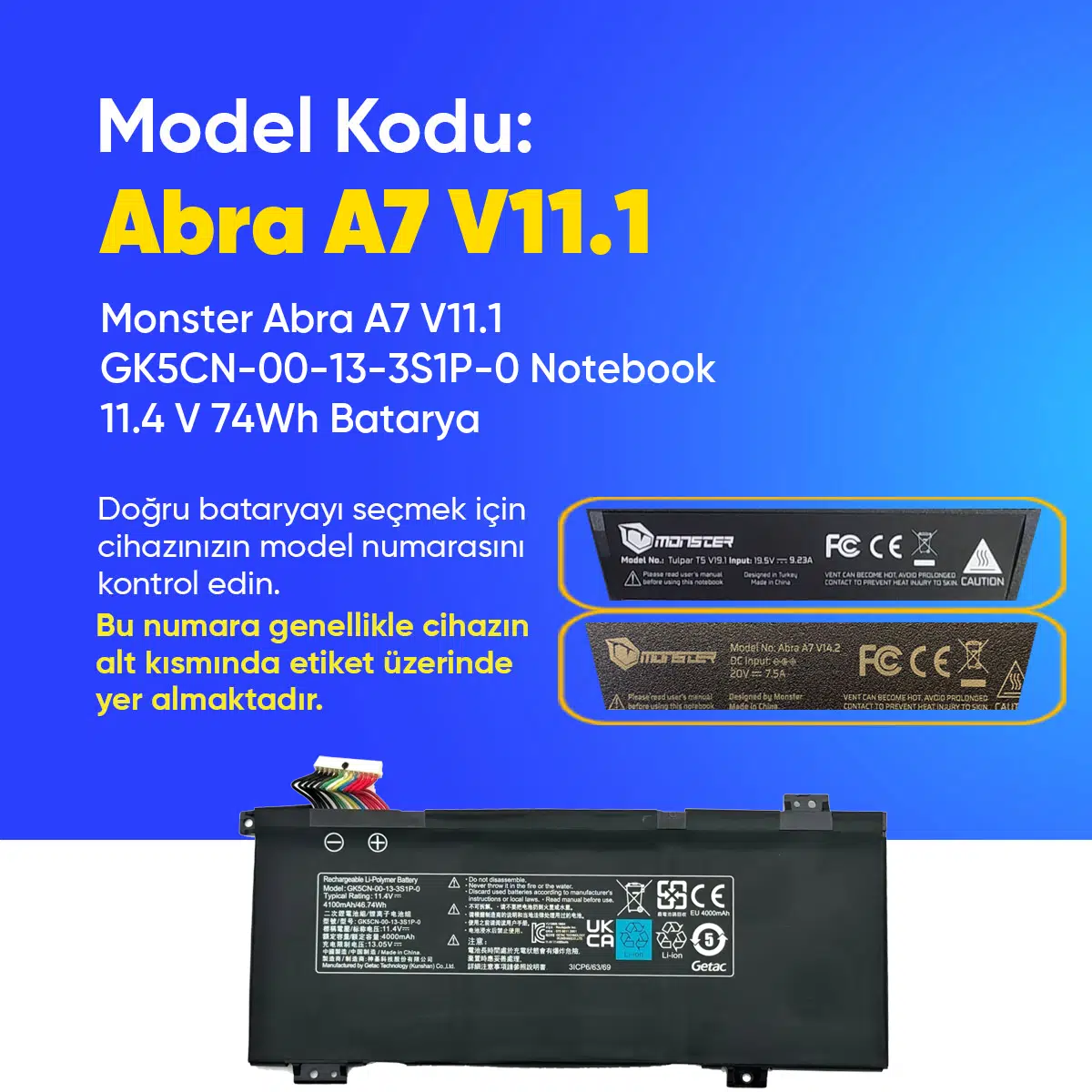 | Etiketler | Monster Abra A7 V11.1 GK5CN-00-13-3S1P-0 Notebook 11.4 V 74Wh Batarya – Orjinal Uyumlu, Yüksek Performanslı |