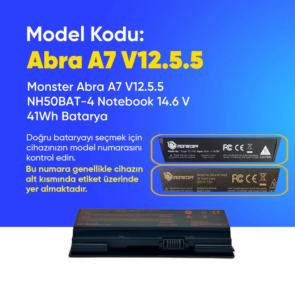 | Etiketler | Monster Abra A7 V12.5.5 NH50BAT-4 Notebook 14.6 V 41Wh Batarya – Orjinal Uyumlu, Yüksek Performanslı |