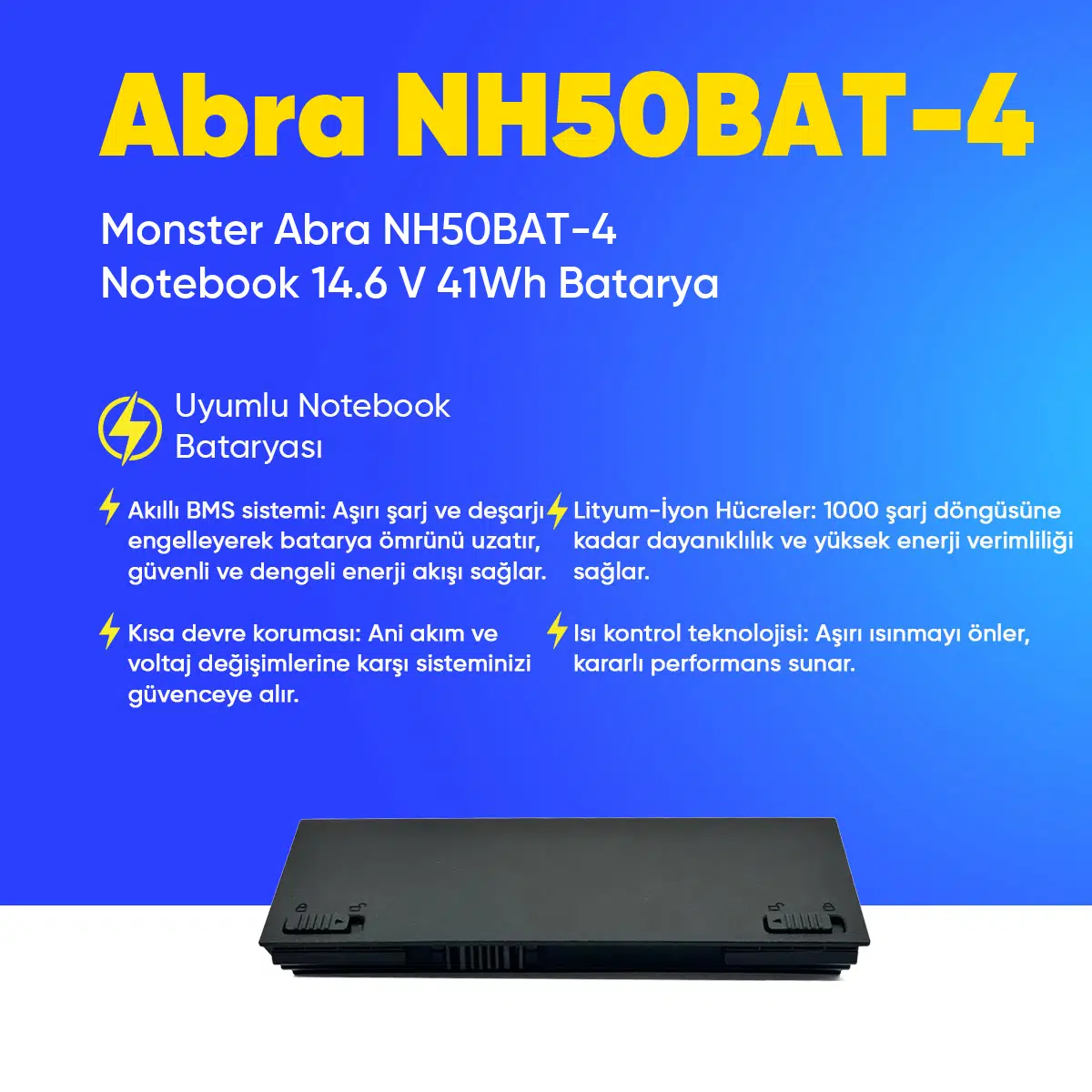 | Etiketler | Monster Abra NH50BAT-4 Notebook 14.6 V 41Wh Batarya – Orjinal Uyumlu, Yüksek Performanslı |