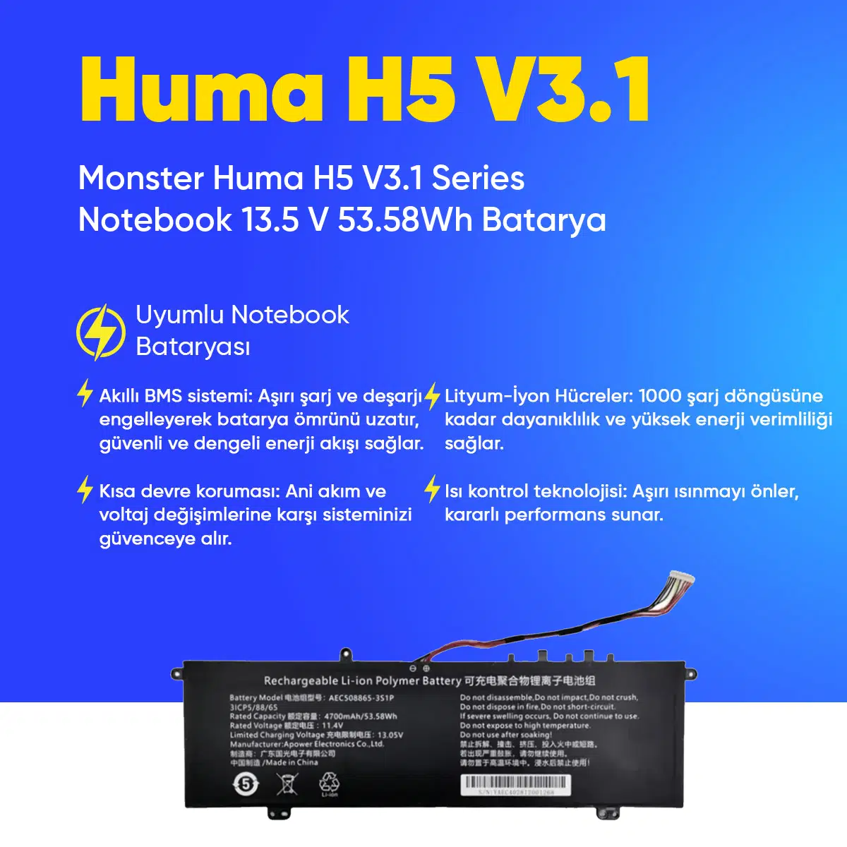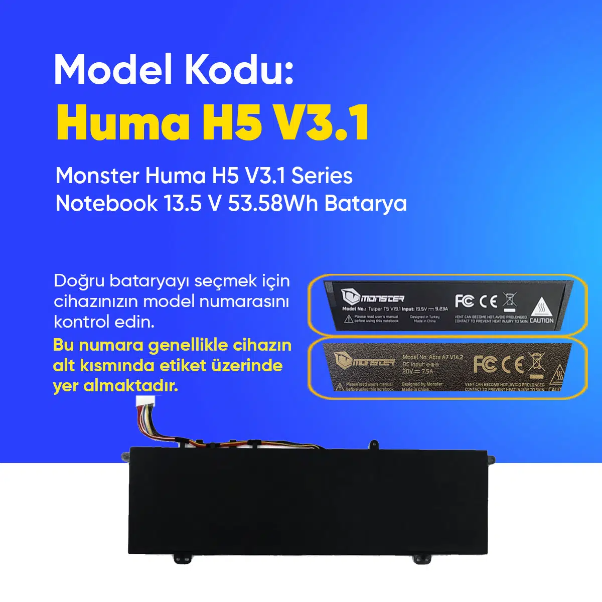 | Etiketler | Monster Huma H5 V3.1 Series Notebook 13.5 V 53.58Wh Batarya – Orjinal Uyumlu, Yüksek Performanslı |