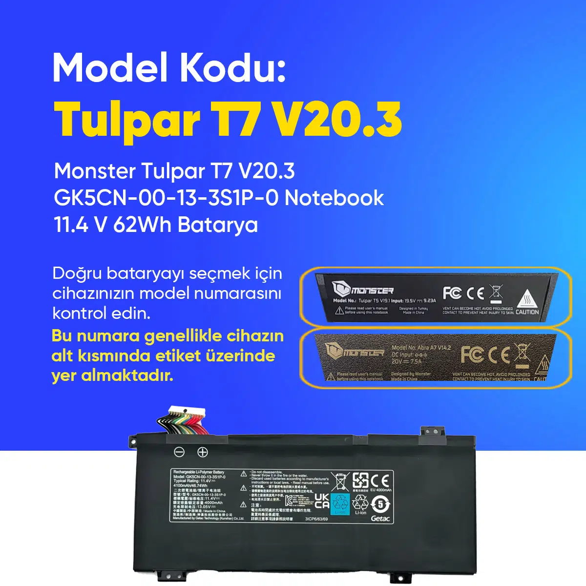 | Etiketler | Monster Tulpar T7 V20.3 GK5CN-00-13-3S1P-0 Notebook 11.4 V 62Wh Batarya – Orjinal Uyumlu, Yüksek Performanslı |
