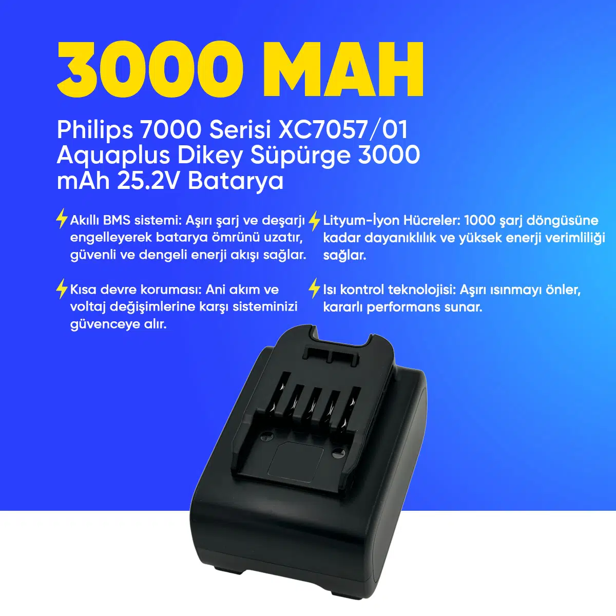 | Etiketler | Philips 7000 Serisi XC7057/01 Aquaplus Dikey Süpürge 3000 mAh 25.2 V Batarya – Orjinal Uyumlu Uzun Ömürlü, Yüksek Performans Pil |