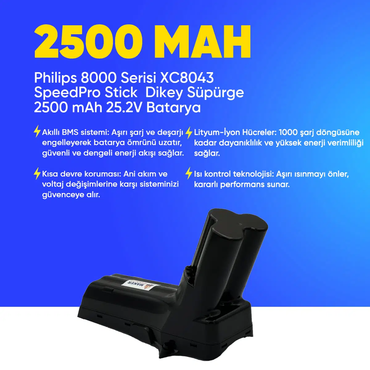 | Etiketler | Philips 8000 Serisi XC8043 SpeedPro Stick Dikey Süpürge 2500 mAh 25.2 V Batarya – Orjinal Uyumlu Uzun Ömürlü, Yüksek Performans Pil |
