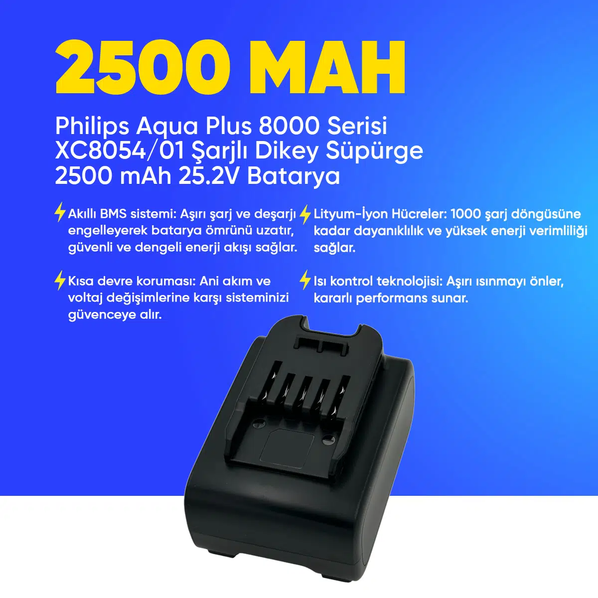 | Etiketler | Philips Aqua Plus 8000 Serisi XC8054/01 Şarjlı Dikey Süpürge 2500 mAh 25.2 V Batarya – Orjinal Uyumlu Uzun Ömürlü, Yüksek Performans Pil |
